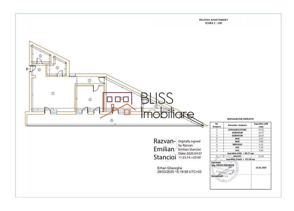 Suprafata totala construită a apartamentului este de 167 mp. Suprafata interioara completa a apartamentului este de 96,41 mp