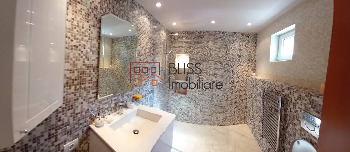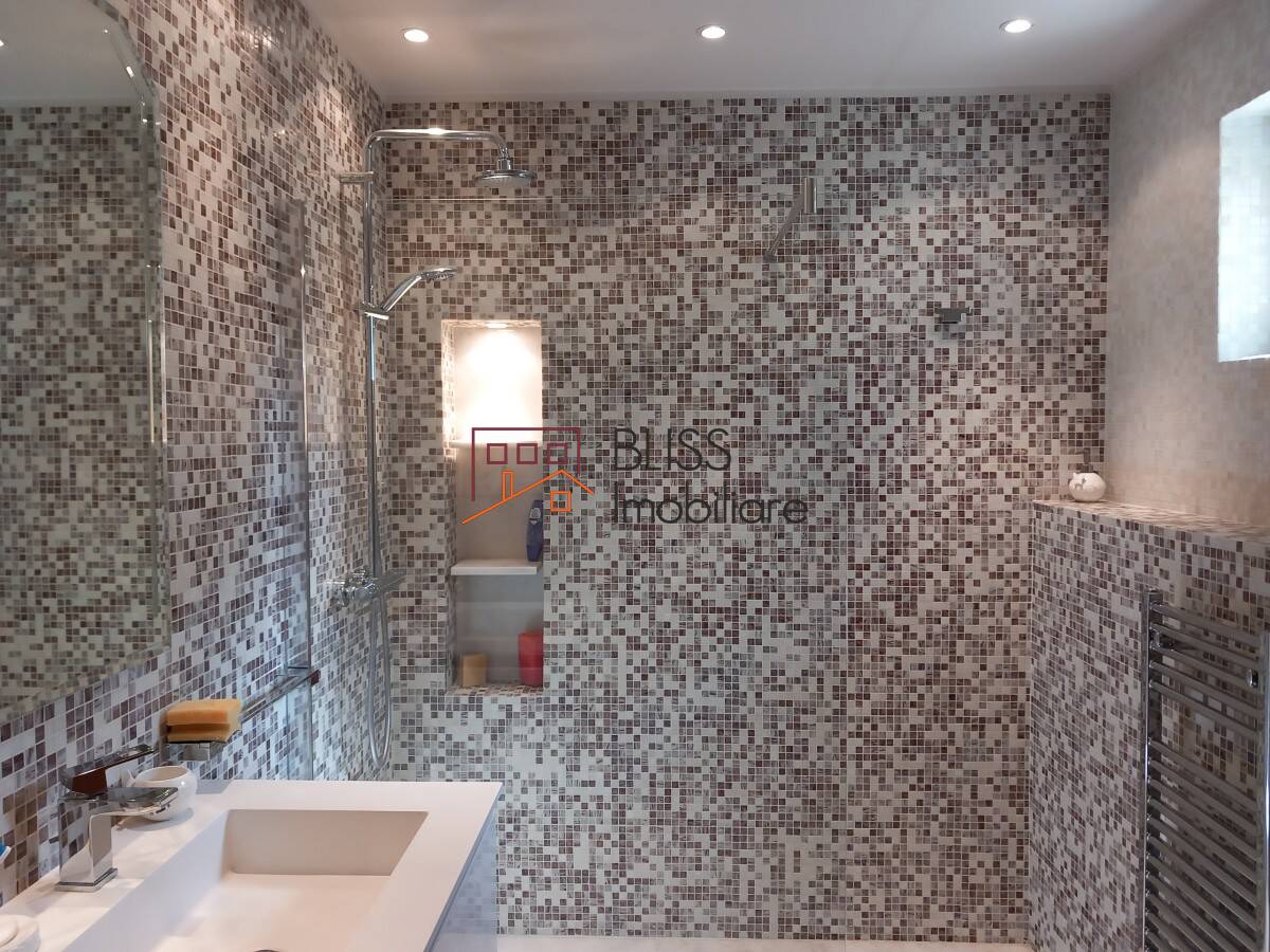 Apartamentul include și o baie modernă, dotată cu accesorii elegante și o cadă cu duș.