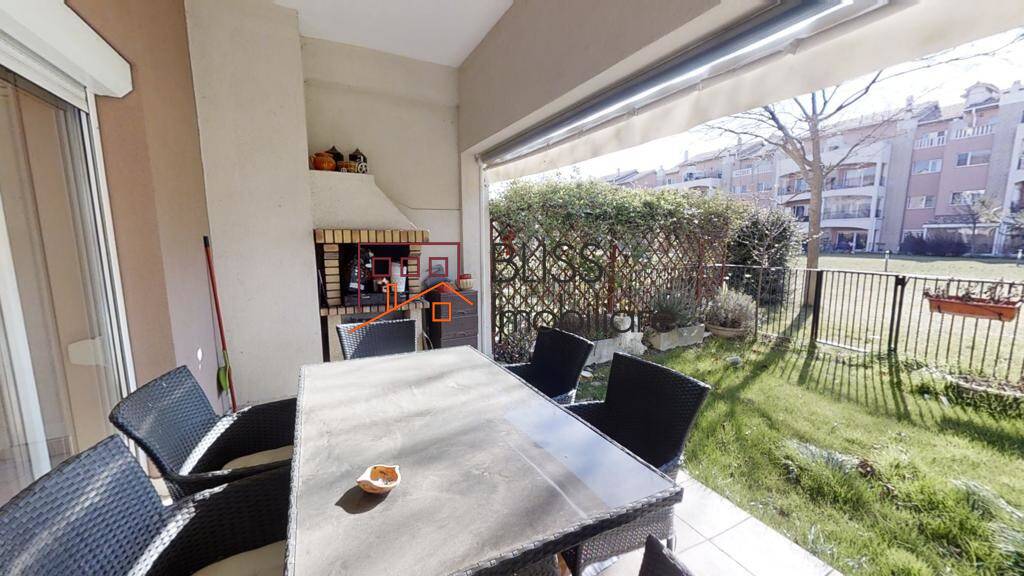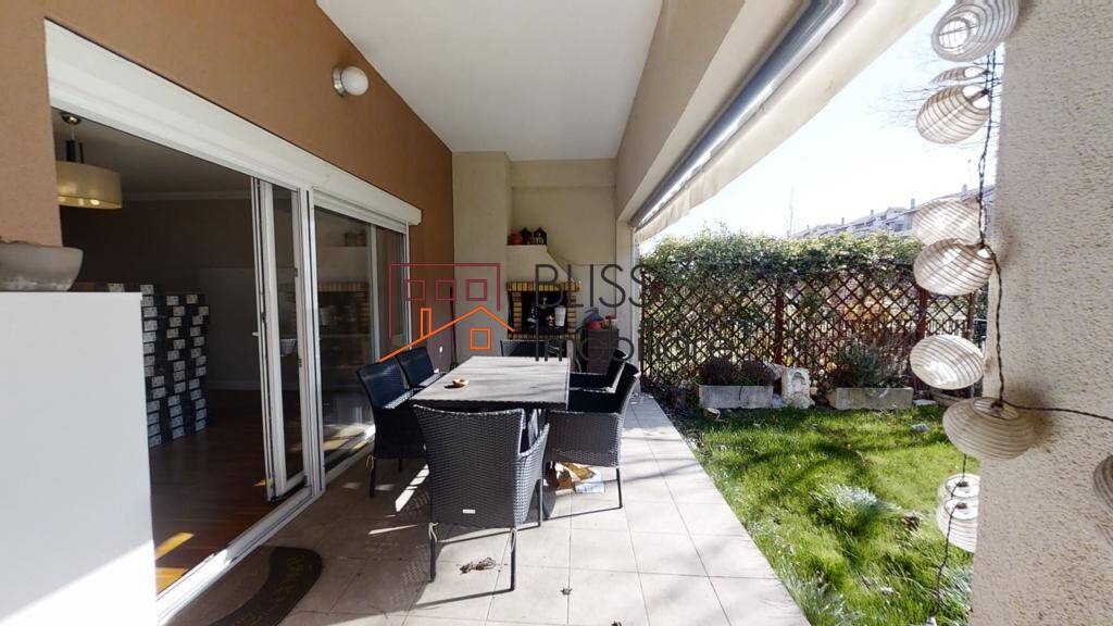 Apartamentul este situat la parter, are patru camere, doua bai, o terasa si gradina spatioasa cu acces direct catre piscina.