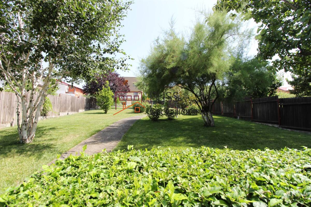 Gradina de 890 mp dispune de piscina, gratar si are un gazon aranjat si bine intretinut si copaci.