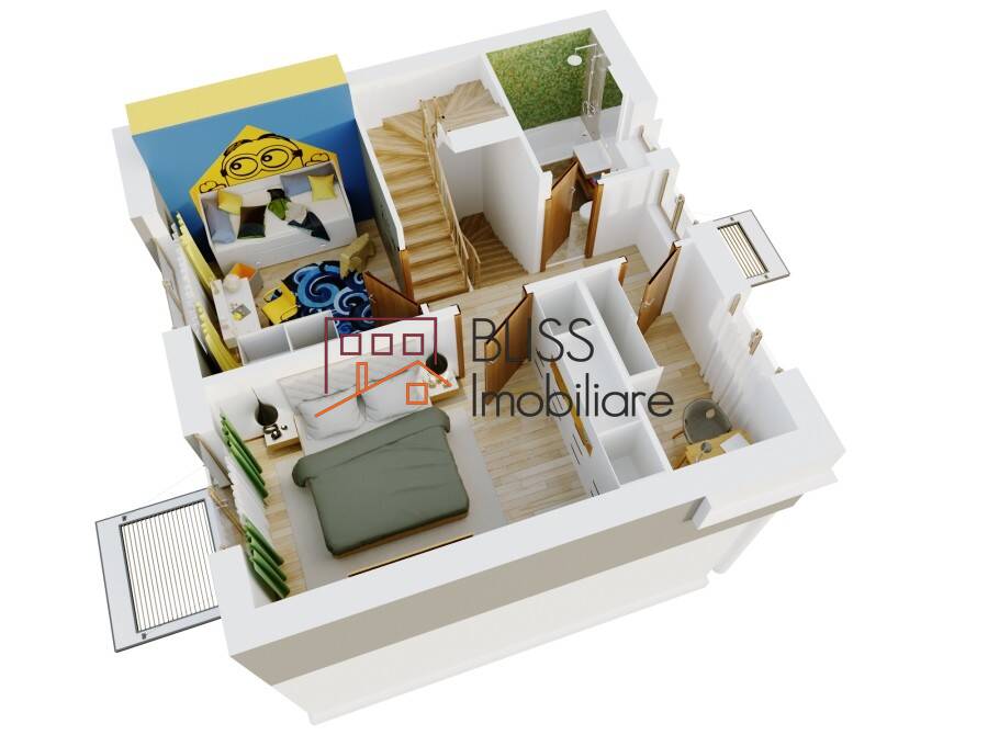 - Etaj 1: ~ 50 mp construiți, 2 dormitoare, grup sanitar, un dressing spaţios care poate fi amenajat ca spațiu de lucru sau birou.