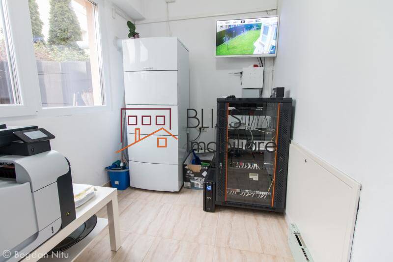 Este complet mobilata si utilata, cu finisaje deosebite, electrocasnice premium, sistem audio BOSE interior/exterior, sistem de supraveghere video, garaj pentru o masina si 2 locuri de parcare in fata casei. Incalzire in pardoseala parter.
