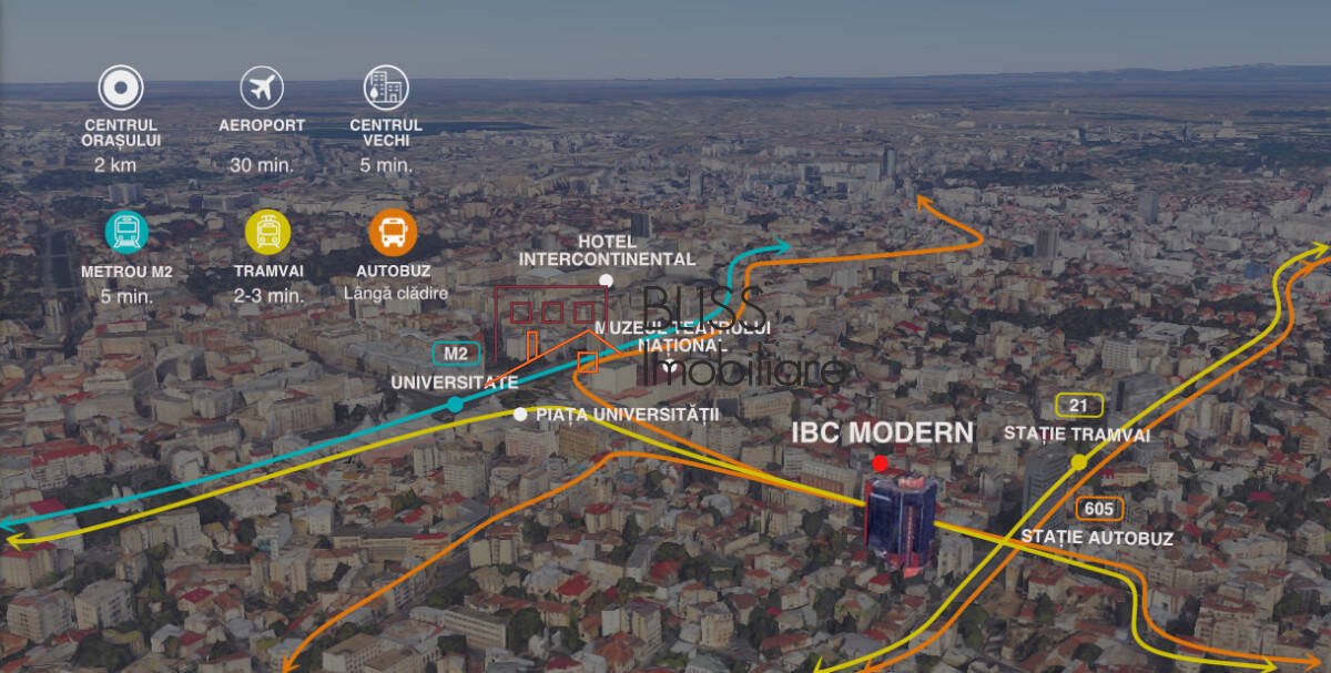 The ultra-central location allows easy access to the public transport network (metro, taxi, buses, trolleybuses and trams). IBC Modern a reference in the real estate market of Bucharest. It was completed in 1996 by transforming the Modern Hotel into the following expansion and modernization works.