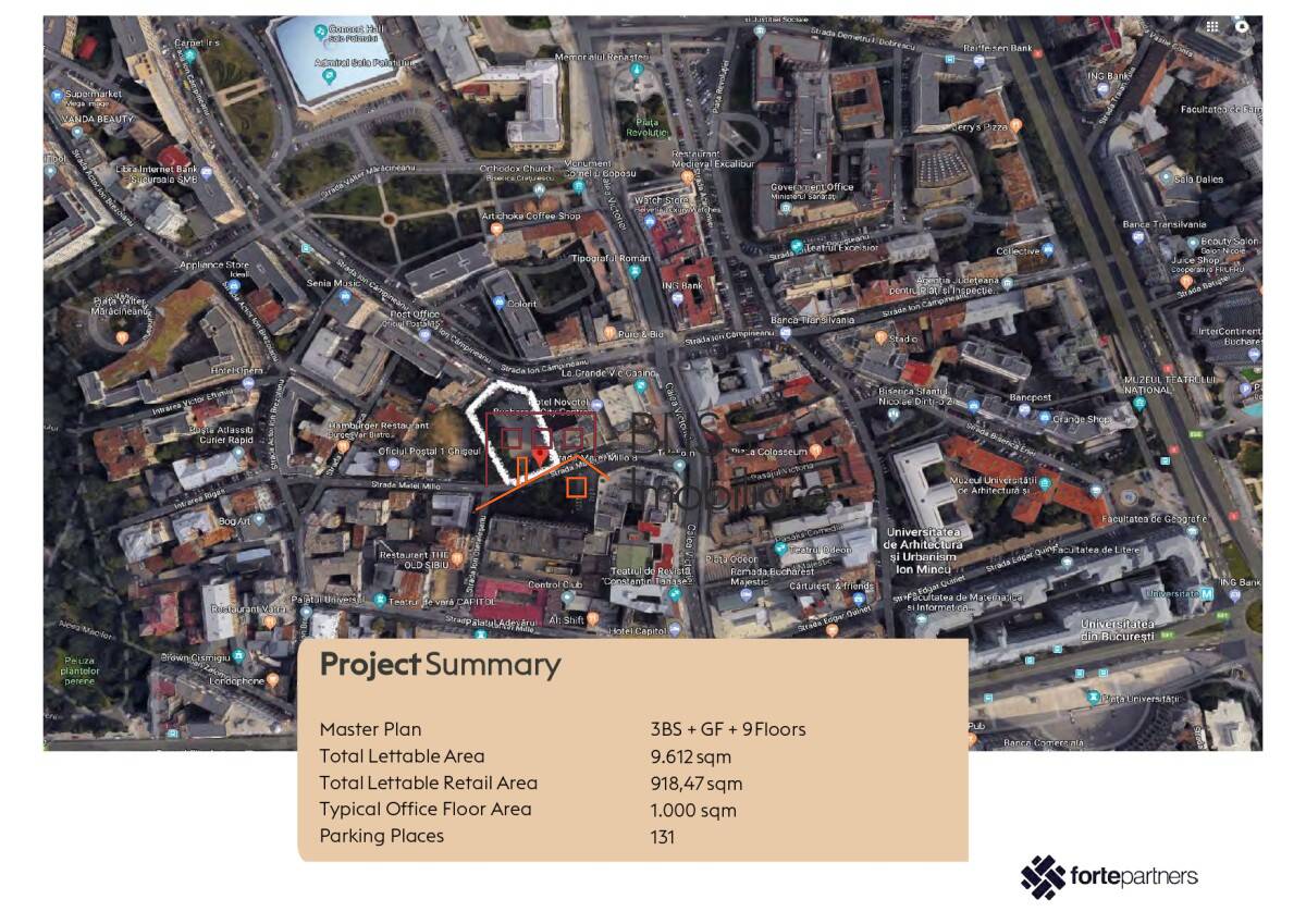 The project benefits from an exceptional location, just 75 meters from Calea Victoriei and 300 meters from Regina Elisabeta Boulevard, respectively 600 meters from University Square. The building's neighbourhoods include various functions: 4-5 star hotels, theatres, offices and administration, commercial spaces, etc.