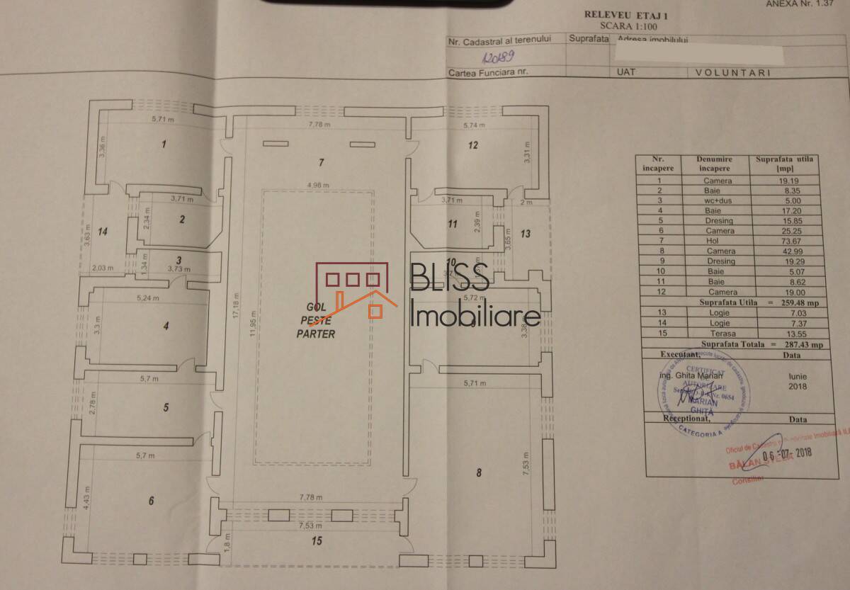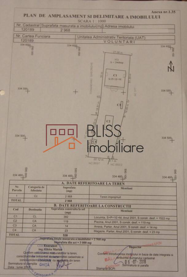 Terenul are o suprafata de 3000mp dintre care 2,600mp gradina unde se afla piscina si foisorul.