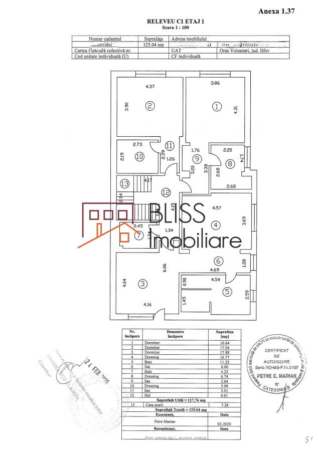 - Etaj 1 — Total: 125,04 mp | Util: 117,76 mp: Dormitor 1: 16,64 mp | Dormitor 2: 17,04 mp | Dormitor 3: 17,88 mp | Dressing 1: 16,77 mp | Dressing 2: 6,74 mp | Dressing 3: 5,98 mp | Baie: 11,22 mp | Baie hol 1: 6,00 mp | Baie hol 2: 5,64 mp | Baie hol 3: 3,01 mp | Hol: 6,61 mp | Casa scării: 7,28 mp