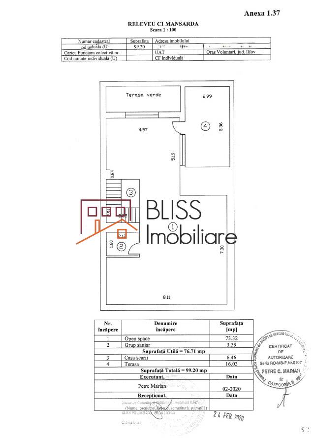 - Mansardă — Total: 99,20 mp | Util: 76,71 mp: Open space 73,32 mp | 2 dormitoare | Grup sanitar 3,39 mp | Terasă verde 16,03 mp | Casa scării 6,46 mp